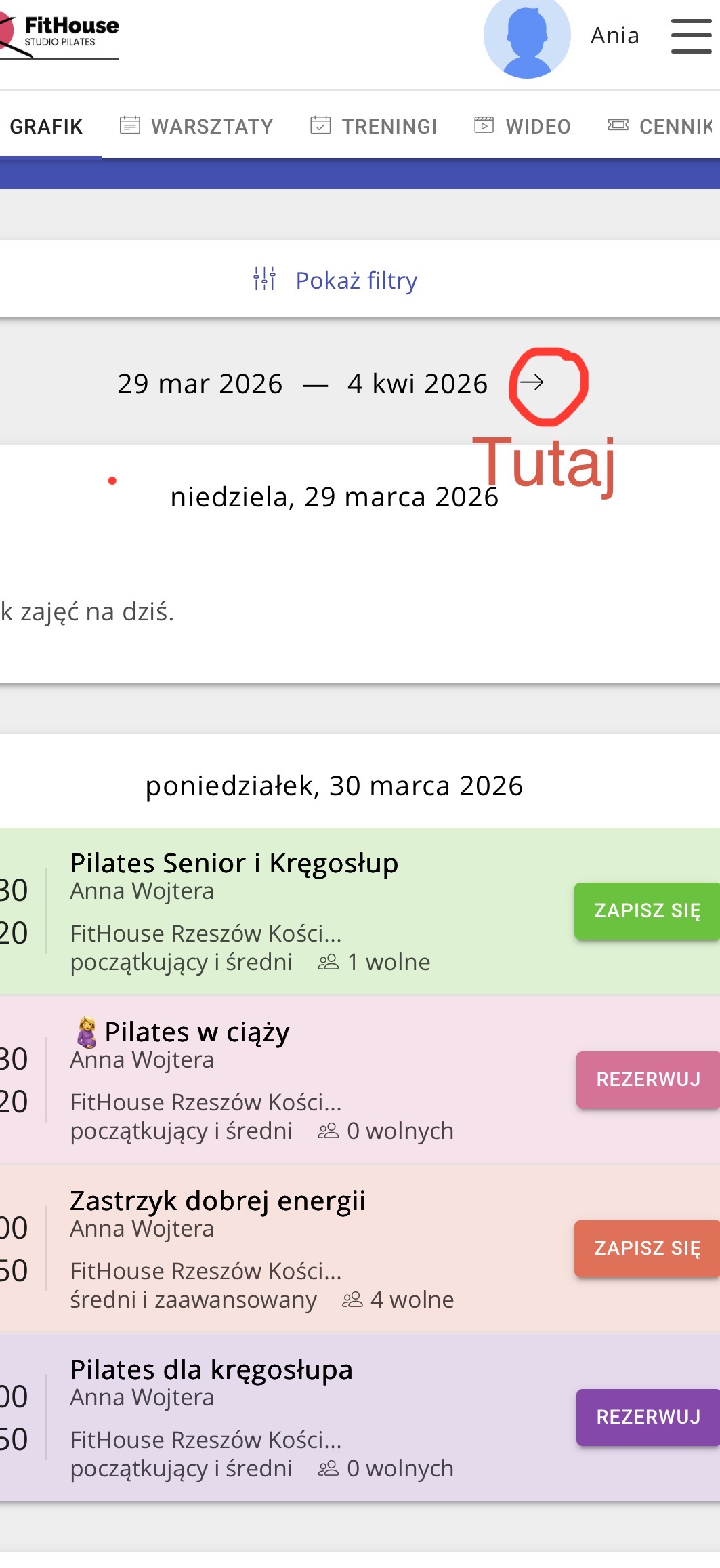 Bardzo proszę o dokonywanie rezerwacji na kwiecień, szczególnie panie z grupy „Pilates w ciąży”. Chciałabym wiedzieć, czy będzie konieczność dołożenia dodatkowych godzin. Pamiętajcie, aby robić rezerwacje z wyprzedzeniem oraz – kupując karnet – od razu zapisywać się na wszystkie zajęcia w jego ramach. Jeśli nie wiesz, jak to zrobić, zapytaj. Przy dacie w grafiku znajduje się strzałka, która pozwala przejść do kolejnych tygodni (zobacz zdjęcie obok).